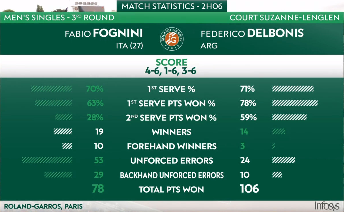 Non ci sono più giocatori italiani nella parte bassa del tabellone del Roland Garros. Fabio Fognini ha perso in tre set un match in cui partiva coi favori del pronostico, contro Federico Delbonis, battuto in 5 confronti diretti su 7 prima d’ora (l’ultimo tra l’altro al Roland Garros 2019, in 4 set. Delbonis ha vinto nettamente in poco più di due ore di partita, 6-4 6-1 6-3 e ha raggiunto gli ottavi di finale di uno Slam per la prima volta in carriera a 30 anni. L’occasione per Fabio era abbastanza ghiotta: avrebbe giocato per la quarta volta gli ottavi a Parigi, lo Slam in cui riesce a esprimersi al meglio. Fin dall’inizio però si è trovato indietro nel punteggio e ha commesso una marea di errori non forzati, in particolare dal lato del rovescio (oltre a non essere mai stato incisivo).