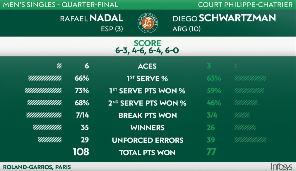 Il contraccolpo del set perso distrugge mentalmente Schwartzman, che comincia il terzo set perdendo i primi quattro game – il parziale totale è di sedici punti ad uno. Come già successo nelle scorse sfide al Roland Garros, il tennista argentino è crollato al momento di confermare l’altissimo livello mostrato nei primi due set. Nadal non si fa problemi a conquistare un altro break e con facilità chiude il quarto set senza lasciare game al suo avversario – è il 23° bagel che infligge qui al Roland Garros, il secondo di fila dopo quello con cui ha frustrato le velleità di Sinner agli ottavi. Questo successo gli vale la quattordicesima semifinale del Roland Garros. Il tennista spagnolo attende ora uno tra Matteo Berrettini e Novak Djokovic.