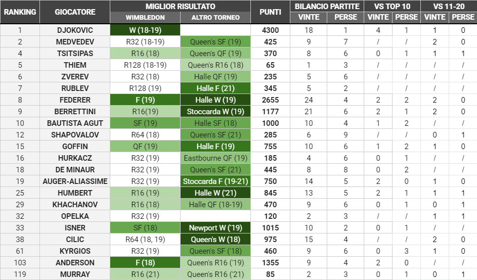 Abbiamo proceduto restringendo il nostro spettro d’analisi a un periodo più recente, considerando esclusivamente i piazzamenti nei tornei giocati sull’erba nelle stagioni 2018 e 2019 e quanto accaduto la scorsa settimana, durante la quale erano calendarizzati i due tornei più importanti di preparazione a Wimbledon, gli ATP 500 del Queens e di Halle.
