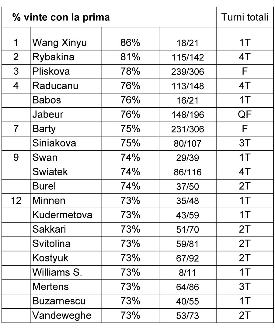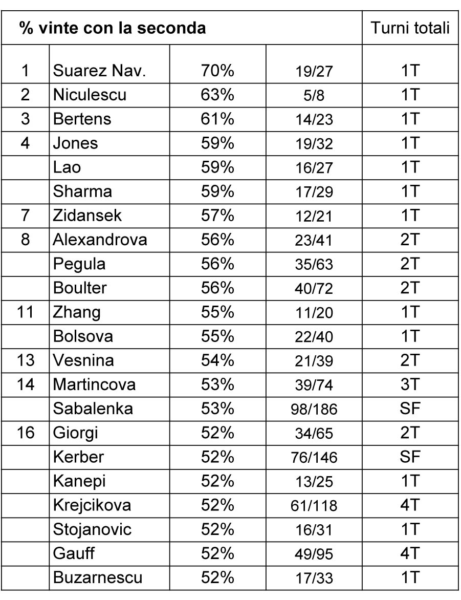 Segue la classifica relativa alla percentuale di punti vinti battendo la seconda di servizio. Una statistica importante ma che nel caso specifico non è molto significativa per la presenza ai vertici di tante giocatrici uscite ai primi turni. Come sempre, più i dati di riferimento sono limitati (poche partite) meno attendibili sono i valori. In ogni caso cominciamo a trovare nomi di tenniste che non basano il proprio gioco soltanto sulla grande incidenza del servizio, ma anche sulla capacità di scambiare. E così ritroviamo con numeri molto simili tenniste molto diverse come Sabalenka, Kerber, Gauff e Krejcikova.