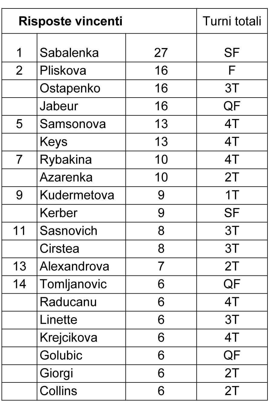 Eccoci alla parte relativa alle risposte. Cominciamo con le risposte in campo. Depurando i numeri da chi si è fermata nei turni iniziali, a primeggiare è proprio la vincitrice del torneo Ashleigh Barty (terza assoluta con l’85%). Una statistica che testimonia quanto sia importante questa capacità: non sarà spettacolare e vistosa quanto un vincente, ma cominciare a regalare poco all’avversaria in battuta, costringendola quasi sempre a giocare almeno un altro colpo, può rivelarsi fondamentale. Nel 2019 Halep aveva conquistato il titolo con l’82% di risposte in campo, mentre nel 2018 Kerber aveva raggiunto il successo anche grazie all’impressionante 89% registrato in questa statistica (primo posto assoluto).