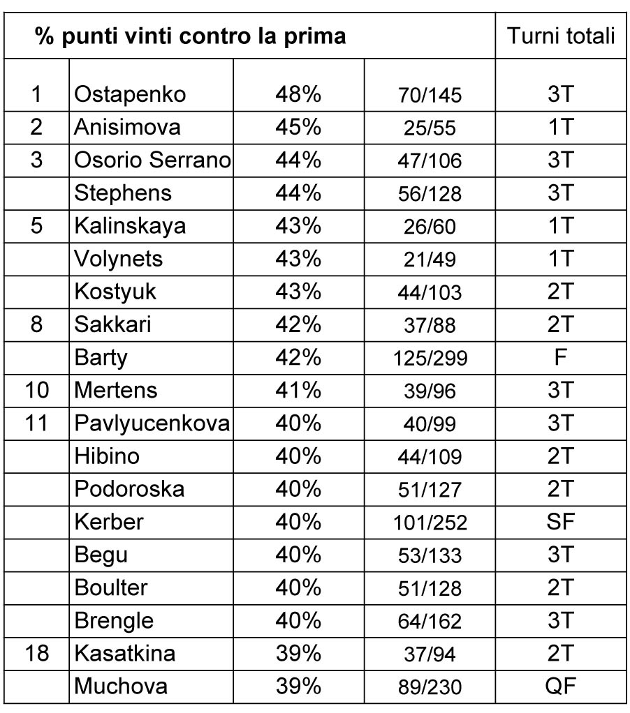 Passo successivo: le statistiche sui punti vinti in risposta. Vale a dire la capacità di entrare nello scambio rovesciando l’influenza del servizio avversario. Prima statistica: punti vinti rispondendo alla prima di servizio. La prima posizione di Jelena Ostapenko spiega, almeno in parte, come Jelena riesca a ottenere risultati malgrado le difficoltà in battuta che ha evidenziato nelle ultime stagioni. In sostanza quello che Ostapenko perde nei turni di servizio riesce almeno in parte a recuperare attraverso le sue qualità di “risponditrice”.