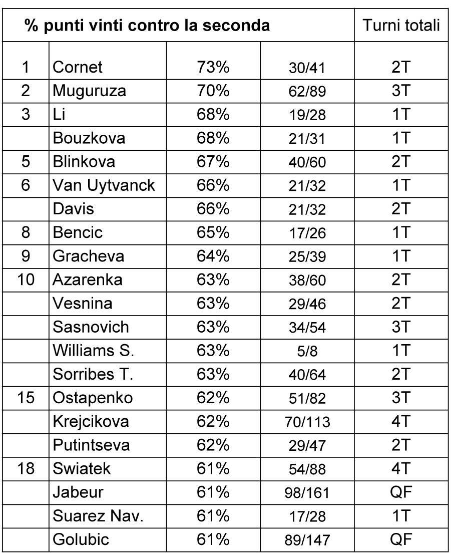 Per quanto riguarda la statistica dei punti vinti rispondendo alla seconda di servizio, segnalo un aspetto curioso. Depurata dalle giocatrici uscite ai primi due turni, comanda Garbiñe Muguruza; poi troviamo un gruppetto di giocatrici attorno al 61-62%: Ostapenko, Krejcikova,, Swiatek, Jabeur, Suarez Navarro… Cosa hanno in comune? Che siamo abituate ad associarle al Roland Garros, anche perché quattro di loro hanno vinto lo Slam parigino (Muguruza, Ostapenko, Swiatek, Krejcikova).
