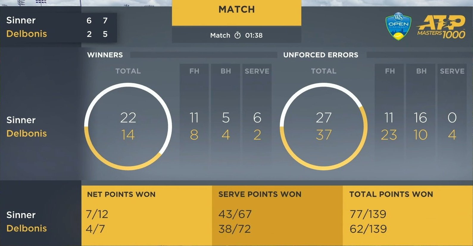 IL MATCH – Con quasi due ore e mezza di ritardo a causa della pioggia, Sinner sceglie di partire in risposta, ma prima c’è il cenno di ringraziamento al pubblico che intona happy birthday. I primi scambi vedono un Delbonis più solido che si guadagna due opportunità nel corso del secondo game, ma un brutto dritto e un ace evitano il peggio. Presa in fretta confidenza la palla e, forse, con il mancinismo dell’altro, tocca allora al nostro mettere mettere la freccia. Il sorpasso arriva al quinto tentativo, agevolato dal doppio fallo argentino, e libera il braccio di Jannik che vola 4-1. Federico si fa un po’ più aggressivo e approfitta di qualche imperfezione azzurra per accorciare, ma il suo dritto concede troppo in cambio di pochi forzati italici e il saldo di quel colpo che fa girare la palla più di 4100 volte al minuto registra zero vincenti e 14 unforced. Sinner risponde bene, è nettamente superiore negli scambi brevi e mette a referto il 6-2. Molto bene il ventenne a rete, con un solo punto perso su sette, mentre “Gordo” non si è mai fatto vedere da quelle parti.