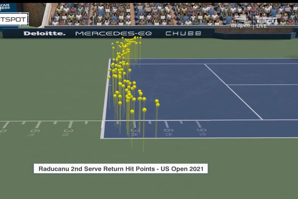 Eppure Raducanu riesce ad avere la meglio anche su di lei. Come mai? Di nuovo: c’è chi dice che Fernandez ha sì giocato bene, ma non ai super-livelli dei turni precedenti. Ma ci sono anche elementi tecnico tattici più oggettivi, che a mio avviso hanno influito. Sicuramente al servizio Fernandez ha subito la aggressività in risposta di Raducanu, che per tutto il torneo ha ribattuto sulla seconda di servizio sempre con i piedi ben dentro il campo. E “sempre” significa davvero sempre, senza alcuna eccezione, come dimostra lo screenshot ripreso da una analisi di fine torneo di ESPN: