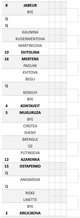 Si trova nella parte bassa l’unica italiana presente al Qatar TotalEnergies Open ossia Jasmine Paolini. La toscana, tuttavia, è subito attesa da un incontro particolarmente tosto contro Mertens, sedicesima testa di serie, con cui ha un bilancio sfavorevole negli scontri diretti (1-2, ma l’azzurra ha vinto l’ultimo precedente a Indian Wells). La vincitrice di questo match affronterà una tra Kvitova e Begu, in quella che sarà una sorta di rivincita dopo la netta affermazione della rumena a San Pietroburgo. La ceca è la campionessa uscente del torneo anche se lo scorso anno l’evento era di categoria 500 (annualmente si inverte la licenza con Dubai). Al terzo turno, inoltre, ad attendere una di queste quattro tenniste ci sarà probabilmente Kontaveit. Decisamente degni di nota anche gli ultimi due possibili terzi turni, ossia Muguruza-Azarenka e Ostapenko-Krejcikova.