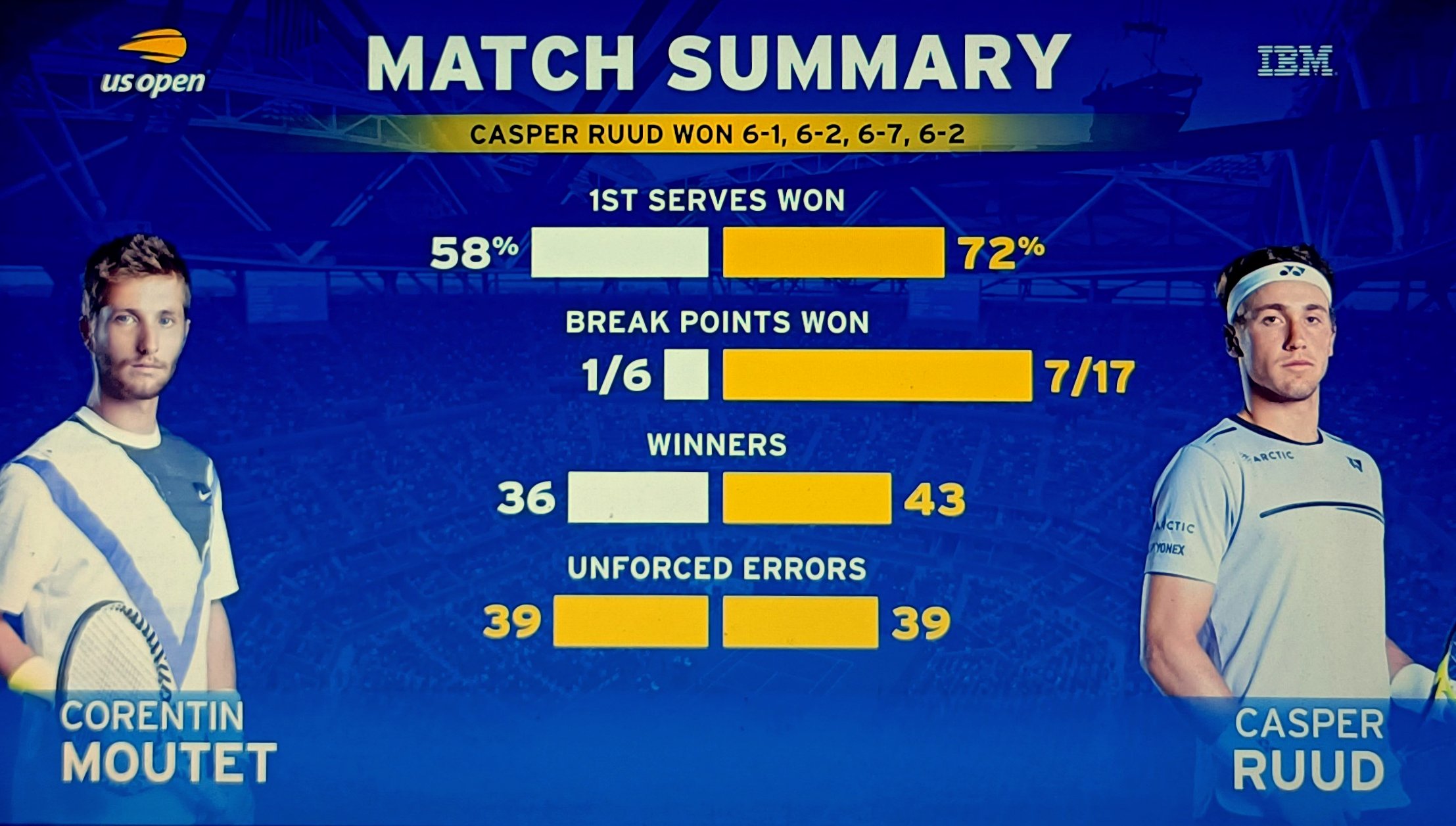 Casper Ruud domina i primi due set di una partita poco spettacolare contro il coetaneo francese Corentin Moutet. La partita sembra stia per finire molto velocemente quando Ruud inizia a distrarsi e a commettere troppi errori. Moutet vede uno spiraglio e cambia ritmo fino ad arrivare al tiebreak del terzo set. Il norvegese credeva di aver vinto e forse è proprio per questo che commette un doppio fallo fatale nel tiebreak che concede il terzo set al francese. Tutto da rifare. Dopo un inizio di quarto set turbolento e molto falloso da parte di Casper, il norvegese riesce a riprendersi una partita che era sempre stata sua, e con un break di vantaggio, va a vincere 6 a 2 il quarto e decisivo set. Per la prima volta nella storia degli Us Open ci sarà un norvegese ai quarti di finale pronto a scrivere un altro pezzo di storia.