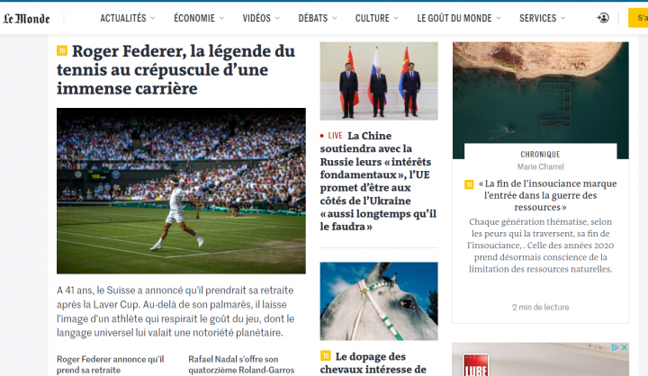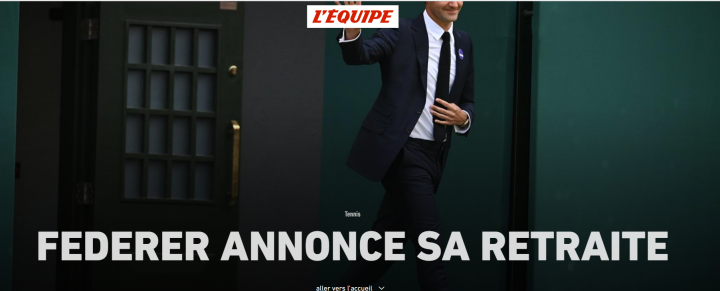 In Francia così apre L’Equipe a tutta pagina: “Federer annuncia il suo ritiro”, con l’immagine di Roger che entra sul campo centrale in borghese derivante dall’ultima edizione dei Championships. Anche Le Monde dedica attenzione al campione elvetico.