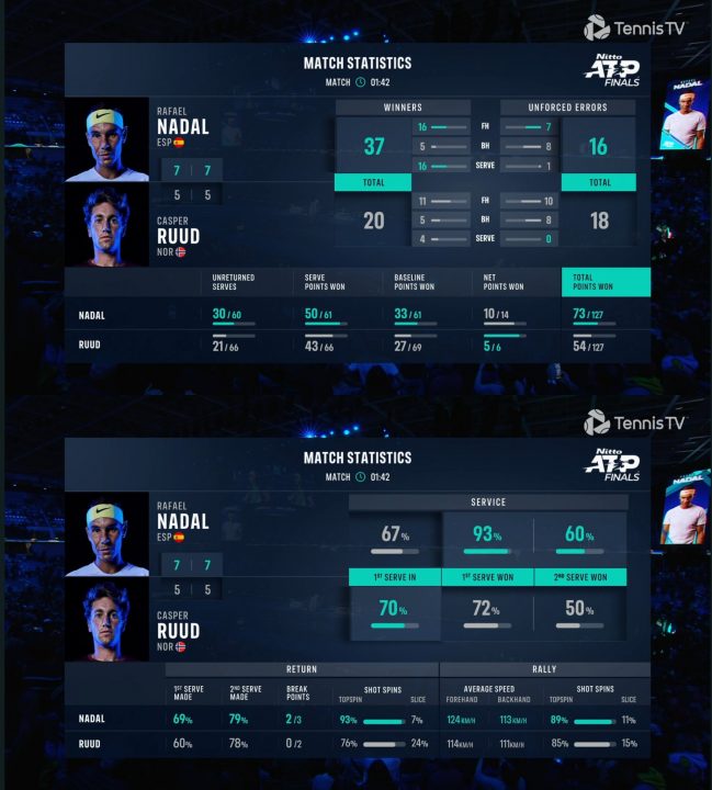 Simply. Too. Good. 💪@RafaelNadal defeats Casper Ruud 7-5 7-5 at the #NittoATPFinals pic.twitter.com/bPc8nR7cb6