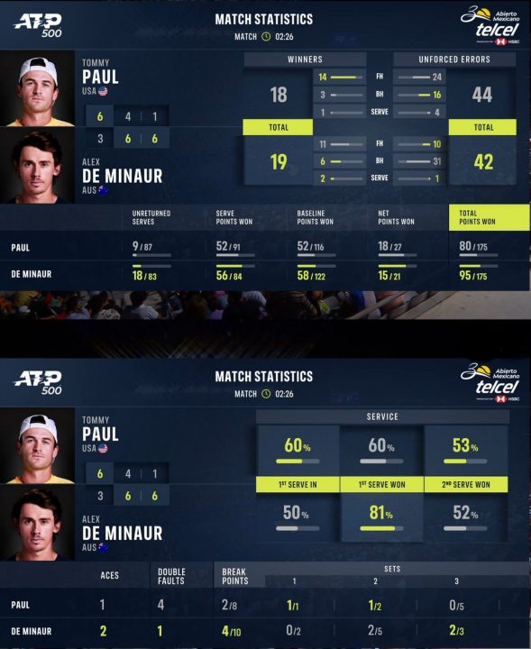 L’Abierto Mexicano Telcel presented by HSBC ha un nuovo nome da inserire nel suo albo d’oro. La trentesima edizione del torneo messicano premia l’australiano Alex De Minaur, uscito vincitore dopo 2 ore e 27 minuti nella sfida con lo statunitense Tommy Paul.