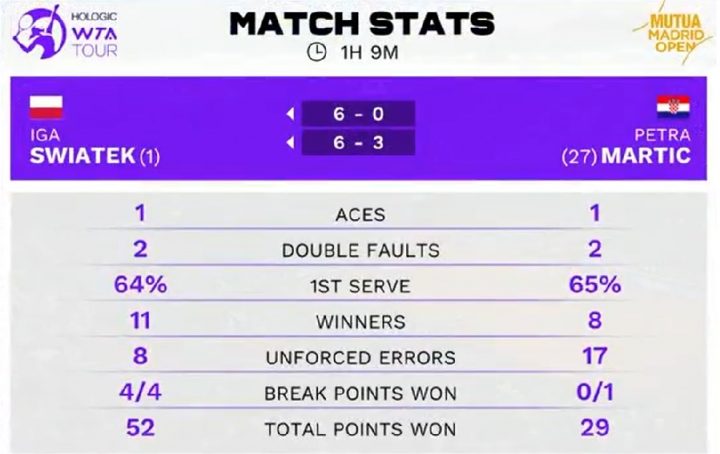 Dopo sette giochi della polacca Martic riesce finalmente a sbloccarsi, alzando la percentuale di prime palle e riuscendo a non offrire palle break nei primi due game in battuta del secondo set. Dal canto suo, Swiatek continua il suo match in modalità cruise-control: servizio efficente, pochi errori e zero chance concesse. L’allungo definitivo arriva sul 3-2 in favore della testa di serie n°1, che alza i giri del motore e trova il break che decide il secondo parziale, rispondendo bene e salendo sul 5-2. La croata prova ad allungare l’incontro, ma ci riesce solo per qualche minuto: Iga non ha problemi ad imporsi 6-0 6-3 in appena 70 minuti, confermando il trend che la vede sempre vincente quest’anno dopo aver conquistato il primo set. Giovedì sera affronterà Veronika Kudermetova in semifinale, contro cui ha vinto tutti e tre i precedenti lasciando per strada, complessivamente, appena otto game.
