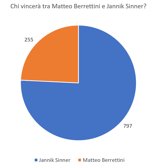 Ecco il risultato finale del sondaggio: alle 22.15 hanno votato 1052 lettori, più di tre quarti dei quali hanno pronosticato che sarà Jannik Sinner ad aggiudicarsi il match.
