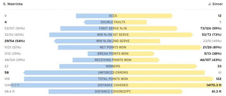 Tuttavia nei game seguenti i palleggi da fondocampo diventano più equilibrati, Sinner fatica a trovare le soluzioni vincenti ed è lui quello che sbaglia prima. Stan controlla agevolmente i suoi turni di battuta e poi incassa un brutto passaggio a vuoto di Sinner che toccandosi la schiena commette tre gratuiti e un doppio fallo regalando il 6-2 a Wawrinka.