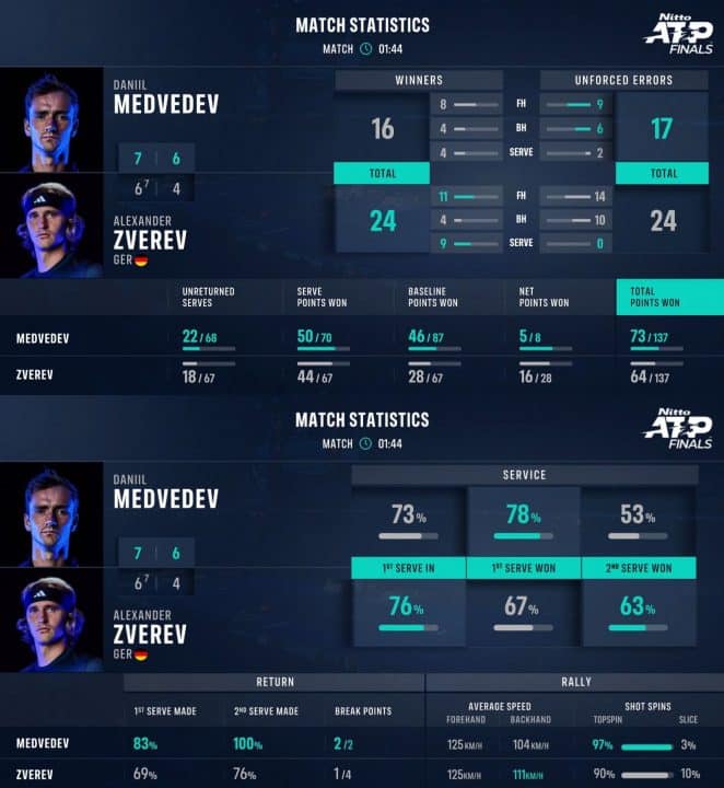 Riecco i duellanti Daniil Medvedev e Alexander Zverev, al loro sesto scontro diretto della stagione (ultimo capitolo a Pechino). Vince il russo 7-6(7) 6-4 che contiene con successo le iniziative del tedesco, inizialmente piuttosto falloso ma più convincente dalla metà del primo parziale in poi. Zverev varia per trovare soluzioni più pericolose e fa vacillare il russo, che però ripone completa fiducia nel suo gioco e finisce per trovare la strada giusta: annulla due setpoint nel primo set e finisce per prendersi un nuovo successo al termine di una seconda frazione piuttosto regolare che si conclude all’improvviso con un piccolo esiziale passaggio a vuoto di Sascha. Medvedev sale a due vittorie ed è in semifinale, Zverev e Alcaraz a una, mentre Rublev è fermo a zero ed è fuori dai giochi.