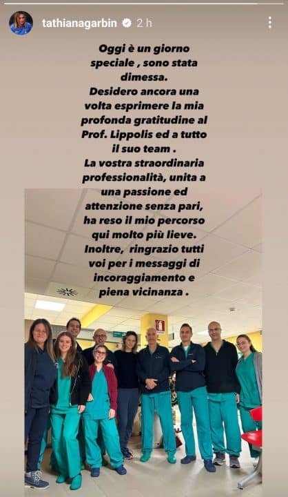 Oggi arriva un’altra lieta ed attesa notizia, ovvero quella delle dimissioni. “Oggi è un giorno speciale, sono stata dimessa” – ha scritto Tathiana, che poi ha voluto ringraziare l’equipe medica che l’ha seguita. “Desidero ancora una volta esprimere la mia profonda gratitudine al Prof. Lippolis ed a tutto il suo team. La vostra straordinaria professionalità, unita a una passione ed attenzione senza pari, ha reso il mio percorso molto più lieve. Inoltre, ringrazio tutti voi per i messaggi di incoraggiamento e piena vicinanza” – ha ammesso Garbin su Instagram. Questo il testo completo: