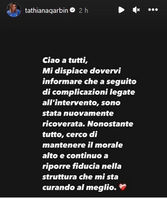 “Mi dispiace dovervi informare che a seguito di complicazioni legate all’intervento sono stata nuovamente ricoverata.