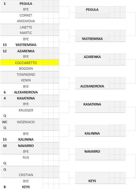 Nel secondo quarto della parte alta ecco la russa Daria Kasatkina, testa di serie numero 4, e Madison Keys, numero 8. Insieme a loro due usufruiranno di un bye anche la tennista di casa Emma Navarro e l’ucraina Kalinina.