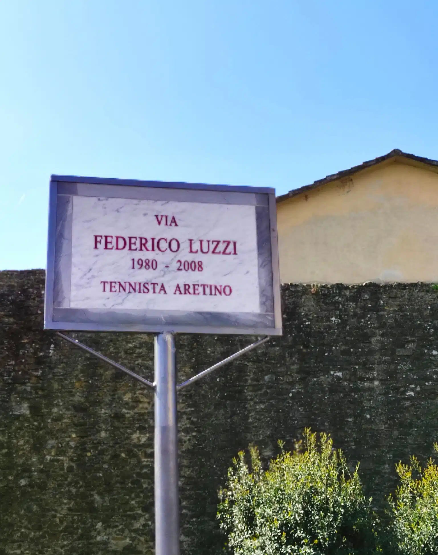 Giovedì 11 Aprile, la città di Arezzo ha inaugurato una via intitolata al “Tennista Aretino”. Una traversa di viale Santa Margherita distante pochi metri da porta San Clemente e dunque prossima, significativamente, al circolo dove si allenava Federico Luzzi. Durante la cerimonia, la consigliera comunale Meri Stella Cornacchini ha ricordato la straordinaria carriera di Federico e la fondazione di Arezzo creata dai genitori, per la ricerca contro le patologie ematologiche, che oggi porta il suo nome: “Luzzi non ha mai smesso di fare del bene per la sua città in termini di notorietà sportiva mondiale e grazie alla sua memoria, continua a farlo”.  A svelare la targa erano presenti anche l’assessore Francesca Lucherini, la madre Paola Cesaroni, il padre Maurizio Luzzi e la sorella Francesca Luzzi. I genitori hanno ringraziato così i presenti: “il gran numero di persone intervenute dimostra ancora una volta quanto sia stabile e duraturo il ricordo di nostro figlio e ci restituisca forza per proseguire con il nostro impegno”.