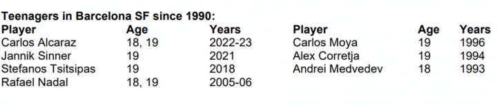 Continua la corsa di Dusan Lajovic che qua a Barcellona raggiunge la sua prima semifinale 500. Vada come vada sarà il miglior torneo del veterano 33nne, numero 59 ATP, dopo la finale raggiunta a Montecarlo nel 2019 e persa contro Fognini. Per Arthur Fils, il 19nne francese numero 36 ATP era un esame di maturità che però il ragazzo non ha approvato. Se ce l’avesse fatta sarebbe stato l’ottavo teenager a riuscire nell’impresa di arrivare in semifinale qui a Barcellona. Scorrendo le statistiche gli altri che ci son riusciti hanno poi fatto parlare di sè abbondantemente.