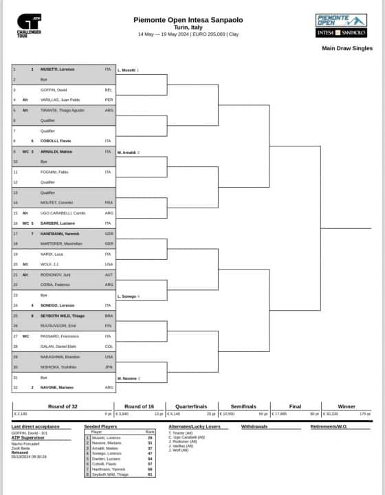 La trasferta piemontese della squadra campione di Coppa Davis verrà completata dal numero 3 del seeding Matteo Arnaldi (che a Roma he perso con Nicolas Jarry) e dal padrone di casa Lorenzo Sonego: il torinese, reduce dal cambio di coach e da una dura crisi di risultati, proverà a ritrovare punti e soprattutto fiducia nel torneo che si svolge nel circolo dove ha la sua base. Il quadro delle teste di serie (salvo eventuali forfait) è completato da due giovani tennisti italiani – Luciano Darderi e Flavio Cobolli, entrambi classe 2002 e reduci dalle confortanti prestazioni romane – da Yannick Hanfmann e da Thiago Seyboth Wild. Ci saranno anche Francesco Passaro, che ha stupito gli Internazionali d’Italia con una serie di vittorie al fotofinish, Fabio Fognini e Luca Nardi.