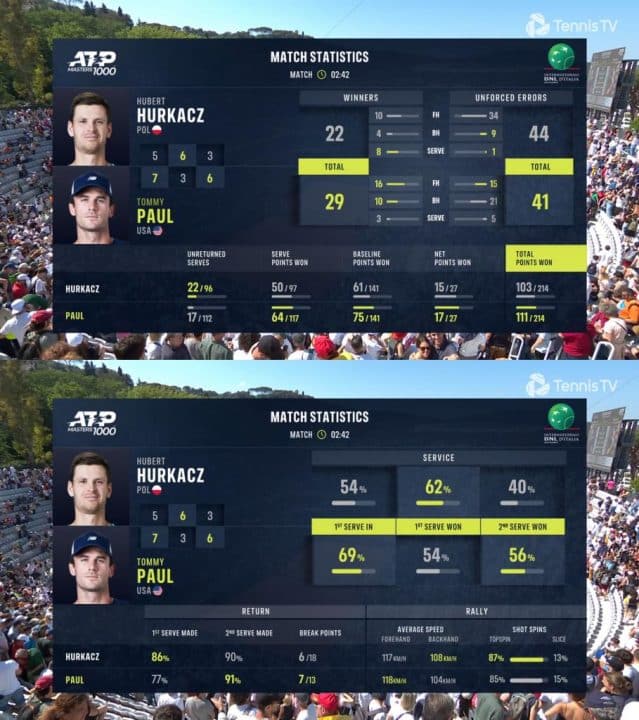 Anche nel secondo parziale Paul prova subito a piazzare la zampata, trovando un break immediato ancora con buona grazia di Hurkacz, messo in difficoltà al servizio da un avversario che risponde molto avanti. Sempre con la battuta, e ritrovando un po’ di smalto a rete, riesce però ad evitare il patatrac definitivo annullando due palle del doppio break nel terzo game. E dà così un’importante sterzata al set, riuscendo al termine del game più lungo dell’incontro a recuperare lo svantaggio salendo di ritmo in risposta e stemperando l’entusiasmo di Paul. Un break che si disvelerà poco dopo in tutta la sua pesantezza, con un altro break addirittura a 0 a favore del polacco, che infila un parziale spaventoso di 6 game a 1 per portare il match al terzo. Bravo lui ad aumentare il proprio e a smascherare le insicurezze dell’altro, che si scioglie del tutto rimandando errori continui, di fretta e probabilmente una certa frustrazione per l’occasione sprecata.