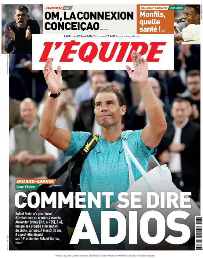 “Comment te dire adieu” cantava nel 1969 Françoise Hardy. “Come dirsi addio“ titola invece il 28 maggio 2024 L’Equipe, e il riferimento ovviamente è a Rafael Nadal, che ha giocato (forse) la sua ultima partita Slam a Parigi, la numero 116 di cui 112 vittorie (percentuale del 96,5%). Il quotidiano francese lo celebra, oltre che sulla copertina, anche con le successive sei pagine del giornale, e altrettante sono dedicate al resto del torneo. Nadal ha alzato il trofeo del Roland Garros 14 volte in carriera – la prima nel 2005, l’ultima nel 2022 – e sono riportati tutti i percorsi che l’hanno condotto al titolo, con tanto di copertina dell’epoca.