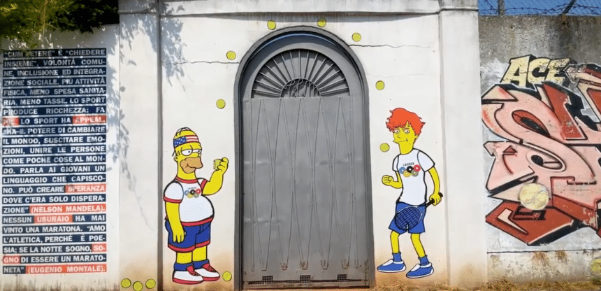 L’opera con Homer si può trovare invece sui muri esterni del Tennis Club Alberto Bonacossa, a Milano, lo storico circolo milanese che ogni anno ospita il Trofeo Internazionale Bonfiglio: ricordiamo che Sinner partecipò per ben due volte all’evento (uno dei più prestigiosi a livello under 18), raggiungendo i quarti di finale nell’edizione del 2018.