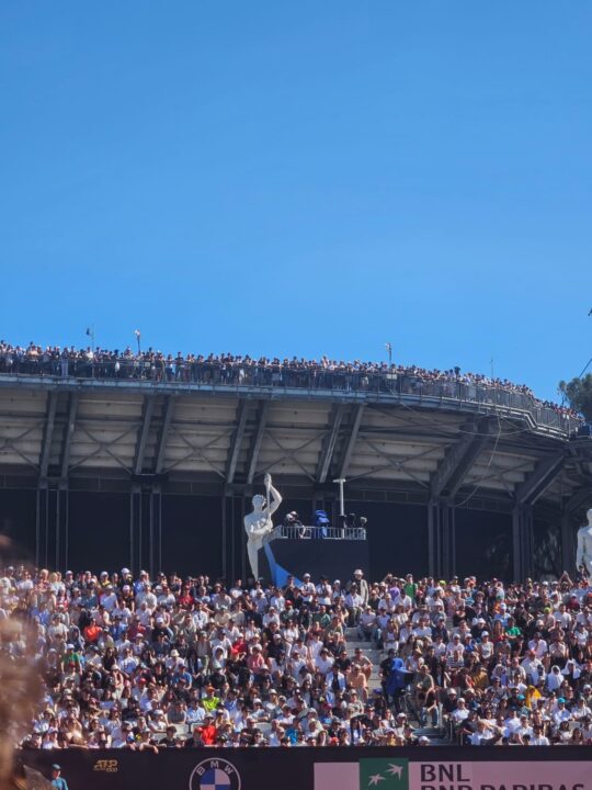 Lo scatto ritrae il pubblico del Centrale, che avrà pagato fior di quattrini , stare in piedi a guardare lo spettacolo Rune-Moutet invece di Gaubas-Zverev. Ed anche questa è una scena a cui nel corso degli anni abbiamo assistito più volte: folle di persone in cima alla Tribuna Internazionale Nord che guardano cosa succede su “un campo secondario”. Che è il vero cuore pulsante del Foro Italico, quell’anima di unicità che crea la perfetta simbiosi tra pubblico e terra rossa. Tra calzini sporchi, sudore e acqua ghiacciata, con le statue a fare da guardia perpetua.