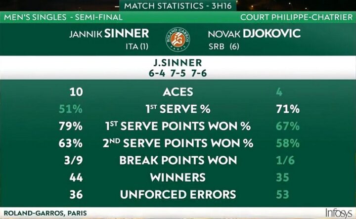 Ciò vuole anche dire che uno tra lui e Alcaraz perderà la propria imbattibilità nelle finali Major (3-0 Sinner, 4-0 lo spagnolo) e ci sarà per la prima volta da Wimbledon 2023, e qui a Parigi dal 2020, una finale tra n.1 e n.2 del mondo. Sono 8-4, Alicante compresa, i precedenti in favore dello spagnolo, che ha anche vinto gli ultimi 4. La partita che tutti aspettavano dunque sarà realtà. Con Sinner che, in ultimo ma non ultimo, diventa l’italiano con più finali Slam al pari di Pietrangeli. L’impressione, più che impressione, è che il sorpasso sia solo questione di tempo. Come da tanto tempo, fine agosto 2024, dura la sua imbattibilità negli Slam. Arrivata a quota 20, pari con Borg (che lo ha fatto due volte) e McEnroe per la settima più lunga dell’Era Open livello Slam.