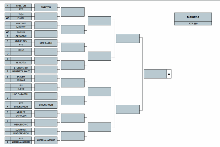 Sorteggiato il tabellone dell’ATP 250 di Maiorca (torneo che lo scorso anno ha visto trionfare il tennista cileno Alejandro Tabilo). A guidare il seeding della kermesse che si svolgerà sul verde dell’erba iberica, sarà lo statunitense Ben Shelton, numero 10 ATP. La testa di serie numero 2, invece, sarà il canadese (n. 27 del ranking maschile) Felix Auger-Aliassime. Sia Shelton che Aliassime esordiranno direttamente al secondo turno. Stesso discorso anche per il numero 3 del seeding, il californiano Alex Michelsen.