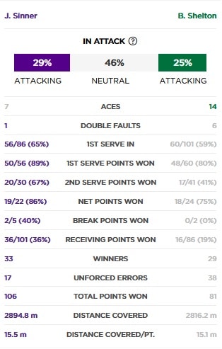 Sinner ha saputo interpretare al meglio una partita potenzialmente insidiosa, contro un avversario capace di spezzare il ritmo e cambiare repentinamente l’inerzia dello scambio con colpi dirompenti. Ma al netto delle fiammate isolate del ventunenne di Atlanta, è stato il giocatore italiano a mantenere costantemente le redini dell’incontro, forte di un tennis sempre più adattato ai ritmi e alle geometrie dell’erba londinese.