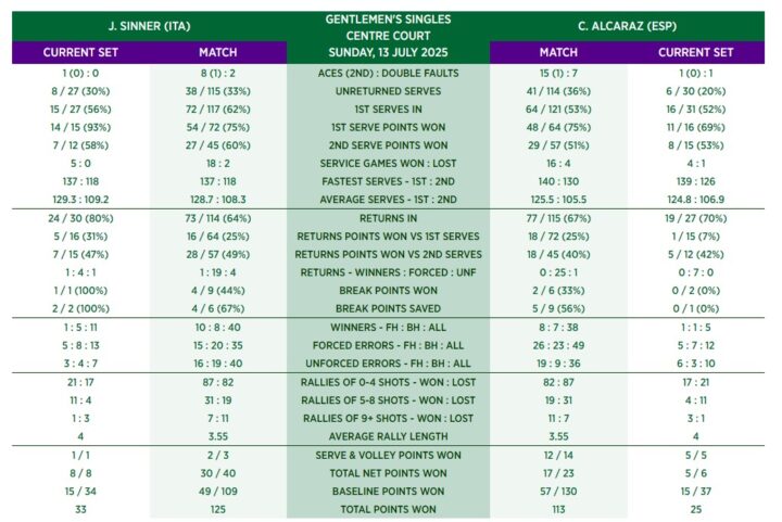 Sinner ha probabilmente perso un set che avrebbe dovuto vincere (il primo, nel quale conduceva 4-2 e palla del 5-2 pesante) ed ha vinto un set che avrebbe dovuto perdere (il secondo, nel quale ha faticato di più nei game di servizio ed ha capitalizzato la distrazione iniziale di Alcaraz), ma quando la battuta è entrata a ritmo è stato probabilmente superiore del suo avversario.