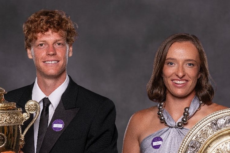 Innanzitutto l’evento, dopo un paio di anni a ridosso dei prati di Wimbledon, è tornato nella sua originaria collocazione, al Raffles London at the OWO, il ‘Luxury’ Hotel da circa 2000 sterline a notte. Al suo interno 25 tavoli, su cui i commensali hanno consumato la cena a base di ‘loyalty toast’, risotto alle capesante e filetto di manzo. Una volta soddisfatto lo stomaco è stato il momento del tanto atteso ballo dei campioni. Da una parte Iga Swiatek con un vestito lungo color grigio perla e scarpe basse. Dall’altra invece Jannik Sinner in Smoking Gucci, che si lascia andare ad una considerazione prima di deliziare i presenti con qualche passo.