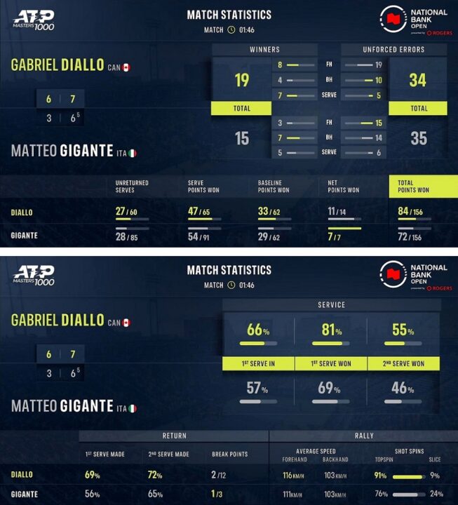 Il cemento di Toronto sorride a Diallo in un primo set che finisce 6-3, ma sarebbe potuto finire peggio per Gigante travolto dal forcing del padrone di casa. Diallo vince un estenuante secondo gioco all’ottava palla break e rischia di andare avanti 4-0. Gigante si scuote e migliora la percentuale con la prima di servizio, anche se non supererà quota 48%. Nel mezzo il “Var” dà ragione all’azzurro che ferma il gioco per aver visto la pallina passare attraverso la rete e non al di sopra.