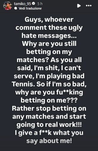Korpatsch ha risposto con parole durissime attraverso le sue Instagram Stories, denunciando il comportamento tossico di chi continua a puntare soldi sulle sue partite e poi la insulta quando il risultato non è quello sperato. “Ragazzi, chiunque scriva questi brutti messaggi pieni di odio… Perché continuate a scommettere sulle mie partite? Come avete detto tutti, faccio schifo, non so servire, gioco male a tennis. Quindi, se sono così scarsa, perché c***o continuate a scommettere su di me??? Piuttosto smettete di scommettere sulle partite e iniziate a fare un lavoro vero!!! Non me ne frega un c***o di quello che dite su di me!”.