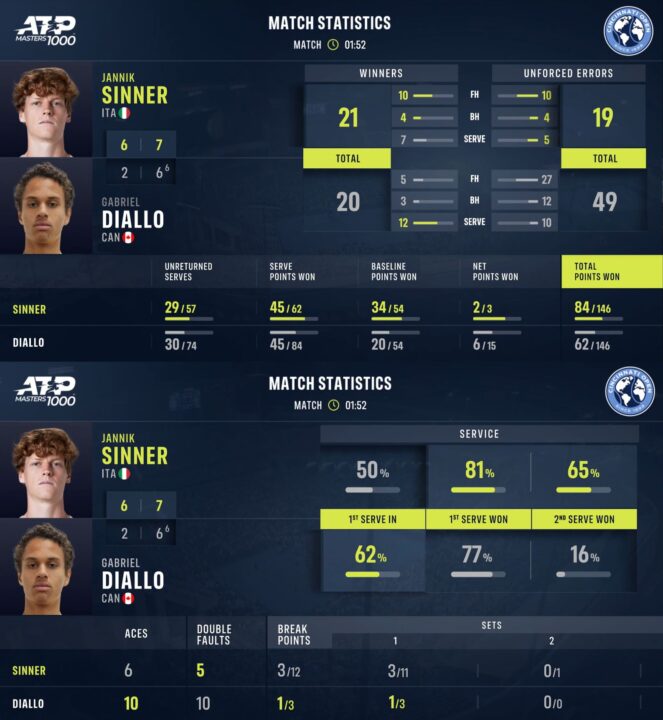 Diallo entra nel match con il servizio a disposizione e ottiene il game con una prestazione a dir poco egregia: sette prime palle su otto in campo, un ace, tre servizi vincenti e un altro che impedisce a Sinner una risposta all’interno delle righe del campo. Ciò nonostante, il numero uno del ranking si arrampica fino alla palla-break: ci si potrebbe chiedere per quanto tempo il tennista canadese possa confermare simili picchi di rendimento e cosa possa succedere quando inevitabilmente le percentuali cominceranno a scendere, senonché Jannik serve tre doppi falli nel game successivo e cede per primo il servizio. Ovviamente è troppo presto per giungere a conclusioni o a paventare scenari grigi, soprattutto perché il numero 30 del seeding nel terzo gioco serve con meno impeto e cede a zero il punto del contro-break.