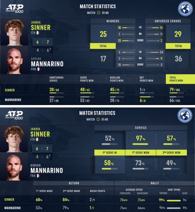 Jannik vince agevolmente il decimo game e il primo set, ma deve dichiarare tredici errori non forzati, di cui nove con il dritto, che perde di non pochi centimetri in almeno tre occasioni. Mannarino si concede addirittura 17 errori gratuiti e il servizio principale dell’asso altoatesino entra nel 44% dei casi.