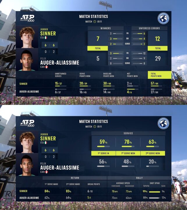Un po’ come Jasmine Paolini, Jannik Sinner comincia come meglio non poteva andando a nozze con la maggior parte degli scambi e aumentando il ritmo, mettendo in seria difficoltà il canadese. Per Auger inizia un vero e proprio incubo e con un’ottima prestazione in risposta non lascia scampo a Felix che non può far altro che incassare un altro break e registrare un passivo di 4-0. Passando appena 19 minuti sul cronometro che Jannik cala anche la cinquina, consolidando il secondo break di giornata e regalandosi la possibilità di chiudere il primo parziale con un bagel. Detto, fatto poiché tra una parte e l’altra della rete sembra di vedere due partite diverse con due ritmi e velocità diverse: Sinner chiude 6-0 contro un avversario con cui non aveva mai vinto finora. Nemmeno mezz’ora di incontro e Felix Auger Aliassime non può far altro che resettare quanto (non) fatto. L’80% dei punti vinti con la prima di servizio per Sinner contro appena il 50% del canadese. Per Aliassime anche 0 vincenti e 13 errori non forzati.
