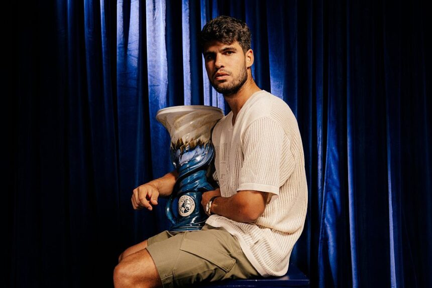 Con ormai un piede e mezzo sull’auto che lo avrebbe portato all’aeroporto per il suo volo privato verso New York, Carlos Alcaraz ha risposto alle domande di rito della stampa dopo la brevissima finale contro Jannik Sinner.