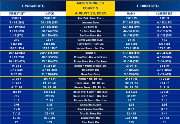 Come detto, aiutato da uno dei tanti doppi falli di Cobolli, Passaro è riuscito a trascinare la partita al quinto set e addirittura strappare il servizio a Flavio in avvio del set decisivo, anche grazie a un game nel quale Cobolli ha messo solamente una prima di servizio in dodici punti. Il perugino però non è riuscito a consolidare il vantaggio subendo un ottimo game di risposta del suo avversario, ed ha poi regalato il break decisivo all’ottavo gioco con il suo dodicesimo doppio fallo.