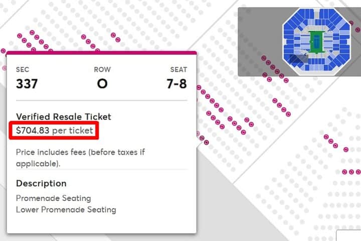 Ora come ora, volendo spendere il meno possibile, sempre per la finale del singolare maschile, rimangono alcuni posti nelle file più lontane (lo vediamo qui sopra), quella che qui viene detta piccionaia, a “solamente” 704 dollari. Ma dovete sbrigarvi, perchè con il “dynamic pricing” che viene applicato, più si avvicina la data dell’evento, più sale la domanda e di conseguenza il prezzo.