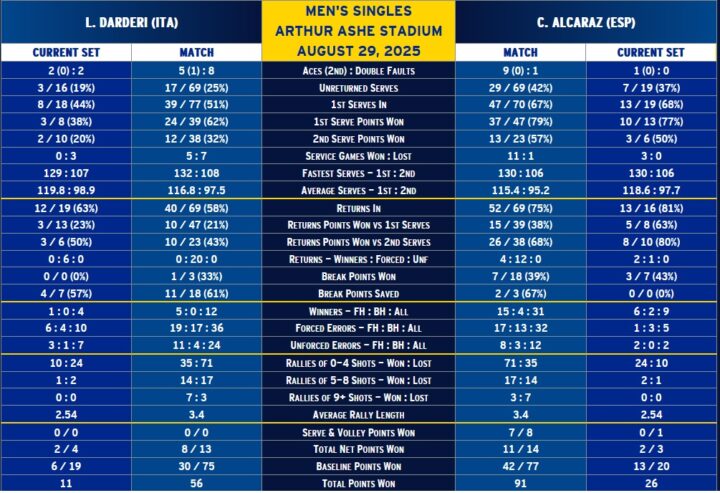 Dal lato opposto, Alcaraz strappa la sua ottantesima affermazione negli Slam e la ventesima allo US Open, che lo fa diventare il quinto tennista tra quelli nati dal 1990 in poi (dopo Thiem, Dimitrov, Zverev e Sinner) a ottenere due decine di successi in almeno tre Major. Venti come le sue vittorie stagionali negli Slam. Solo Rafael Nadal, nel 2007 e nel 2008, è stato più precoce di lui nel catturarle nel 21esimo secolo. La 42esima vittoria nelle ultime 44 partite disputate lo catapulta al 14esimo ottavo Slam, il quarto nella Grande Mela, con il 79% di realizzazione con la prima, 31 vincenti (Darderi 12) e solamente 12 gratuiti (Luciano 24). Per un posto ai quarti, ora, sfiderà il francese Arthur Rinderknech.