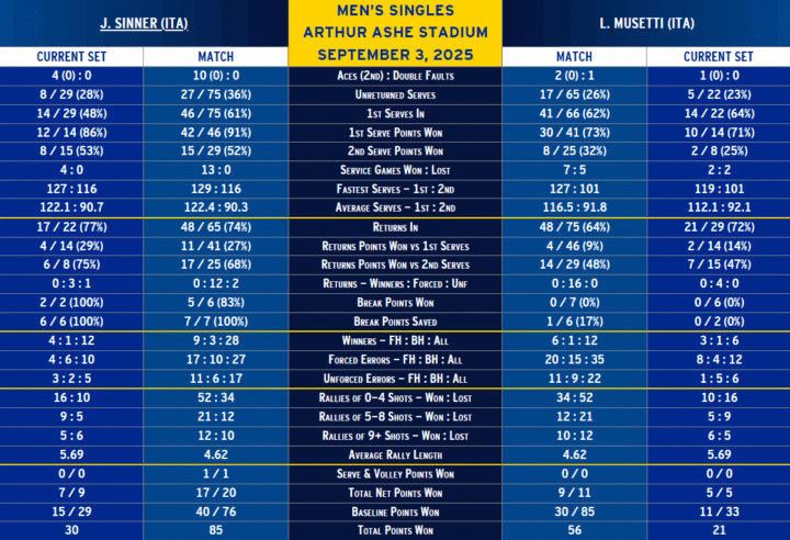La sensazione è che il match abbia ormai poco da dire, e i fatti lo confermano subito: break immediato per Sinner. Nel game successivo, però, Musetti prova a restare aggrappato all’incontro conquistando due palle break. Il carrarino non vuole mollare, non vuole arretrare: la sua prima volta sull’Arthur Ashe deve avere un senso. La prima chance sfuma con un errore di rovescio finito in rete, la seconda viene cancellata da una prima vincente. Sinner sembra avere fretta di chiudere ma concede anche una terza e una quarta occasione, annullate ancora con il servizio e con la solidità dei colpi. Alla fine, un dritto inside-out e un incrociato dal centro gli chiudono la porta in faccia.