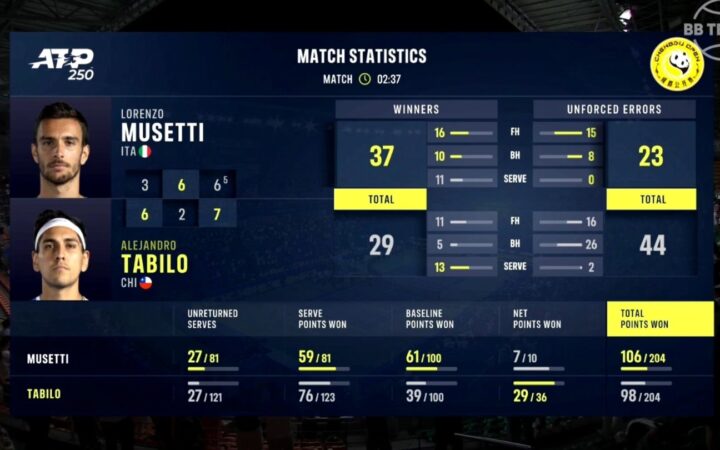 Il canovaccio tattico della partita sembra abbastanza chiaro fin dai primi minuti di gioco: Tabilo, con il suo gioco che assomiglia al fioretto, prova ad anticipare la palla e ad accorciare gli scambi, attaccando la rete con continuità e cercando, di conseguenza, di togliere il tempo all’avversario. Musetti reagisce con freddezza ai cambi di ritmo dell’avversario, aiutato da un rendimento praticamente perfetto con la prima palla di servizio: il carrarino – appena riesce ad allungare lo scambio e la traiettoria dei propri colpi – dà la sensazione di poter controllare il match senza troppi problemi. Lorenzo gestisce con serenità i propri turni di battuta e prova a costruirsi l’occasione giusta in risposta: il cileno si salva ai vantaggi nel terzo game (2 a 1) e annulla la prima palla break della serata nel quinto (3 a 2), aggrappandosi allo slice mancino da sinistra, spesso indirizzato verso il “corpo” del rivale. Tabilo cerca di mettere in campo una prima palla “sicura”, senza cercare necessariamente l’ace: una prima palla propedeutica al colpo in uscita dal servizio, con cui spesso riesce a prendere in mano l’iniziativa. La svolta del set arriva nell’ottavo game: Musetti regala un brutto errore gratuito con il back di rovescio, che prende troppa aria, Tabilo – dal canto suo – indovina una grande risposta anticipata, mette a segno il break (5 a 3) e nel game successivo – nonostante uno splendido passante vincente di Lorenzo – chiude il parziale ai vantaggi, grazie alla solita chela mancina. 6-3 Tabilo dopo 45 minuti di gioco grazie ad una prestazione praticamente perfetta nei pressi della rete (13 punti vinti su 15 discese).