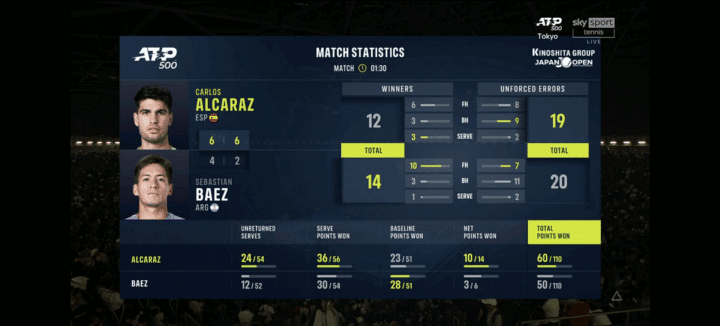 Alcaraz parte subito forte: nel game inaugurale conquista una palla break approfittando della lentezza laterale di Baez. Lo spagnolo impone il proprio tennis, fa muovere l’argentino da una parte all’altra del campo e lo induce all’errore in rete. Break e 1-0. La conferma al servizio arriva senza particolari difficoltà, e sul 2-0 il match sembra ormai nelle sue mani. Baez però non molla: difende con orgoglio il proprio turno di battuta e regala al pubblico un paio di punti da applausi: una smorzata di fino dal lato sinistro e due passanti vincenti che accendono l’entusiasmo sugli spalti giapponesi.