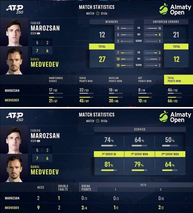 Medvedev ha “acceso” il match nel momento più delicato: sotto 4-5 nel primo set ha cancellato tre set point sul proprio servizio, ha strappato il turno successivo a Marozsan e ha chiuso 7-5. In avvio di secondo parziale il russo ha preso il largo, controllando poi con percentuali pulite: 27 vincenti a fronte di 12 errori non forzati secondo i dati ufficiali ATP. Ancora un dato a conferma della sua solidità: non ha mai ceduto il servizio nell’intero incontro. In semifinale affronterà l’australiano James Duckworth, n.138 del ranking mondiale, giustiziere di [3] F. Cobolli nei quarti. I due si sono incontrati una sola volta, al Masters 1000 del Canada nel 2021, quando Medvedev si impose nettamente con il punteggio di 6-2 6-4. Per Medvedev sarà un nuovo tentativo di tornare in finale: l’ultima risale a Halle 2025, mentre il suo più “recente” titolo resta quello conquistato agli Internazionali d’Italia 2023!
