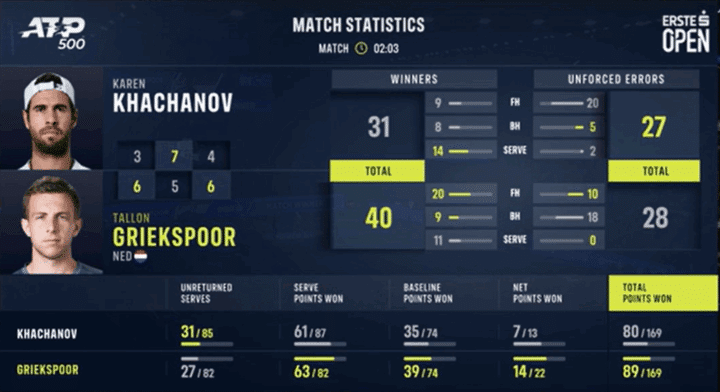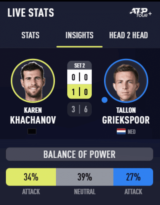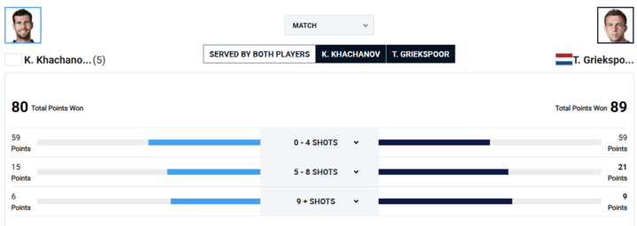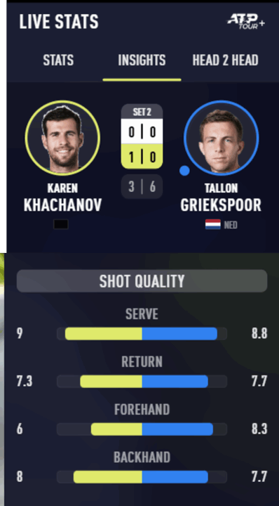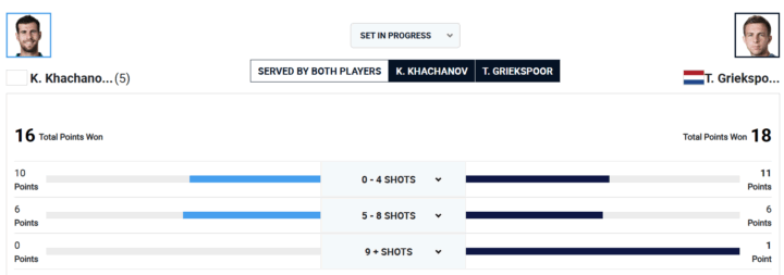 Parziale nel quale il tema tattico è chiaro: Griekspoor ha deciso di lasciare l’iniziativa al suo avversario soprattutto dal lato del rovescio. Sapendo che la diagonale di sinistra è nettamente a favore di Karen, Tallon decide in maniera intelligente di usare sistematicamente lo slice in recupero, con il doppio intento di guadagnare tempo per tornare al centro del campo e proporre una palla senza peso e a volte pure rognosa al suo avversario. Questa sensazione è confermata anche dalle statistiche avanzate di ATP.