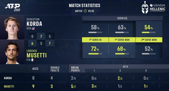 La corsa alle ATP Finals continua. Lorenzo Musetti batte Sebastian Korda nelle seconda semifinale del Vanda Pharmaceuticals Hellenic Championship, impiegando due ore e venti minuti per piegare uno statunitense “rinato” dopo un primo parziale a senso unico.