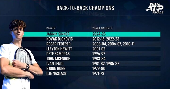 È stato il sesto e ultimo confronto del 2025, tutti in finale come esigono le grandi rivalità, con l’azzurro prima di ora vincitore “solo” a Wimbledon che si accaparra così 5.071.000 dollari e 1.500 punti, lasciando lo sconfitto con 2.704.000 dollari e 1000 punti. In classifica, il numero 2 del mondo insegue a 550 punti. Era dal 2016, quando Murray batte Djokovic, che i primi due del ranking non si affrontavano in finale a questo torneo e hanno offerto un match di altissimo livello, con una palpabile tensione nei primissimi game per poi lasciare andare con sempre più sicurezza i colpi.