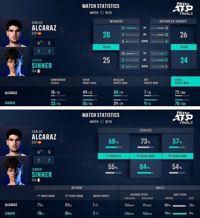 Jannik sceglie di lasciare la battuta a Carlos. A proposito, i due sono arrivati a Torino con una qualità al servizio (dati Insights) rispettivamente di 7,8 e 8,2 come media in stagione e qui l’hanno alzata a 8,4 e 9,1, mentre la riposte hanno fatto registrare nell’ordine un +0,8 e un +0.5. Cose che vorresti dai migliori nel torneo dei migliori.